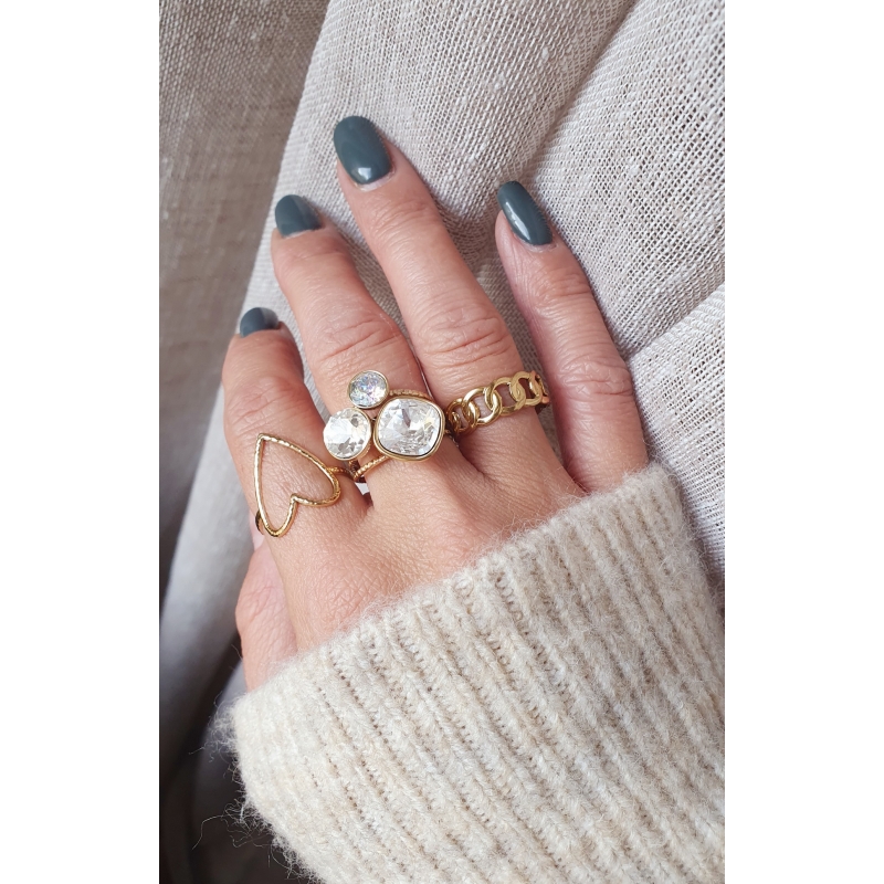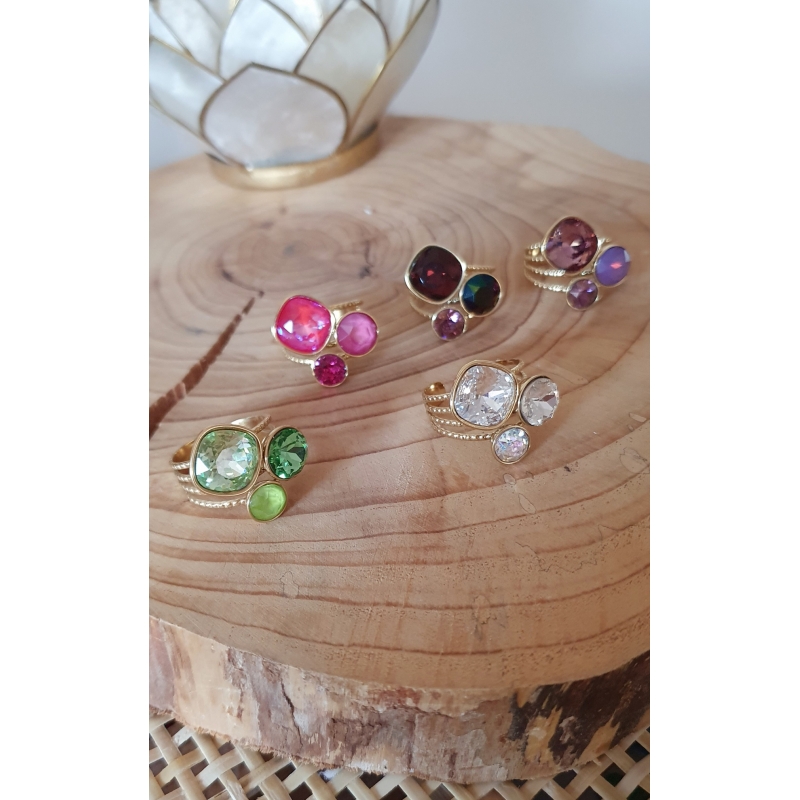 Bague en acier inoxydable composée de trois cristaux taillés.