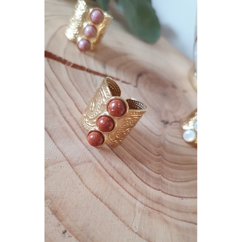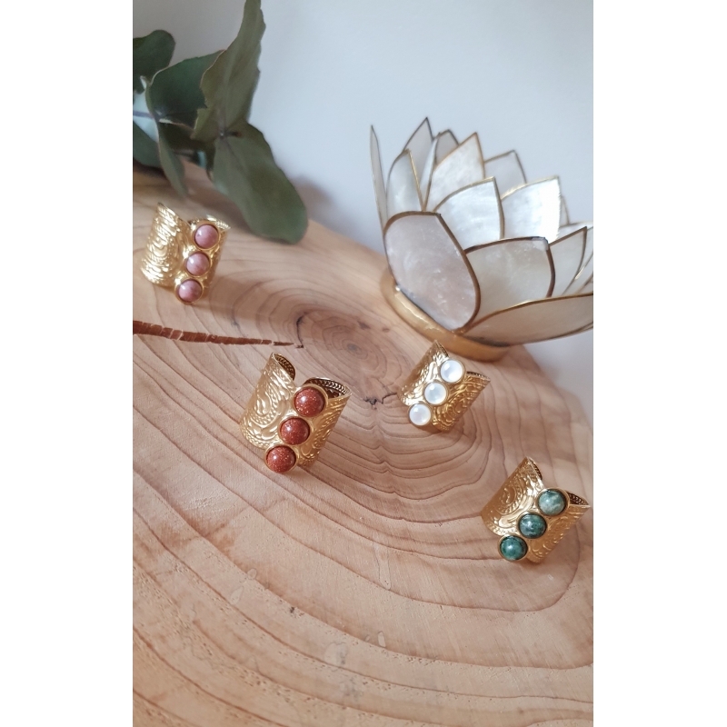 Bague large en acier inoxydable composée de lignes ondulées et de 3 pierres naturelles rondes.