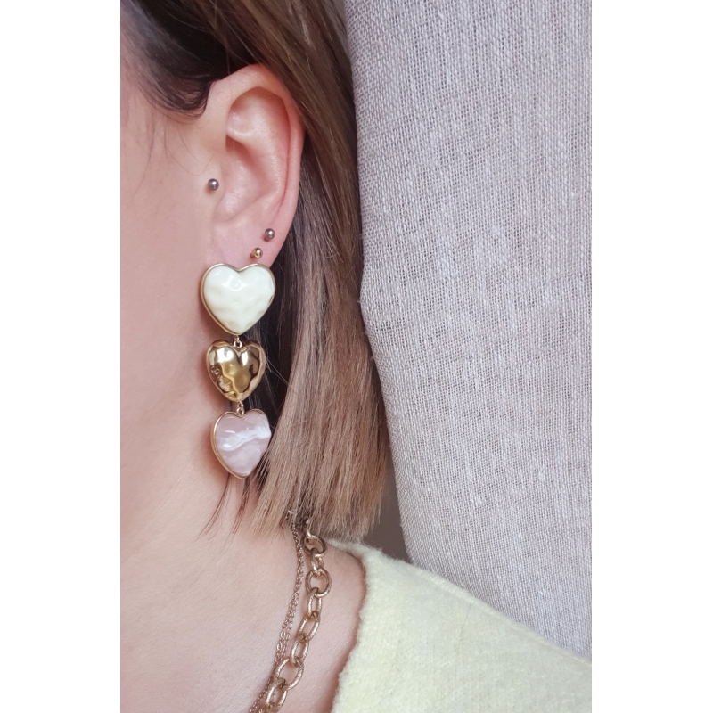 Boucles d'oreilles à puce en acier inoxydable composées de 3 cœurs en acétate coloré.