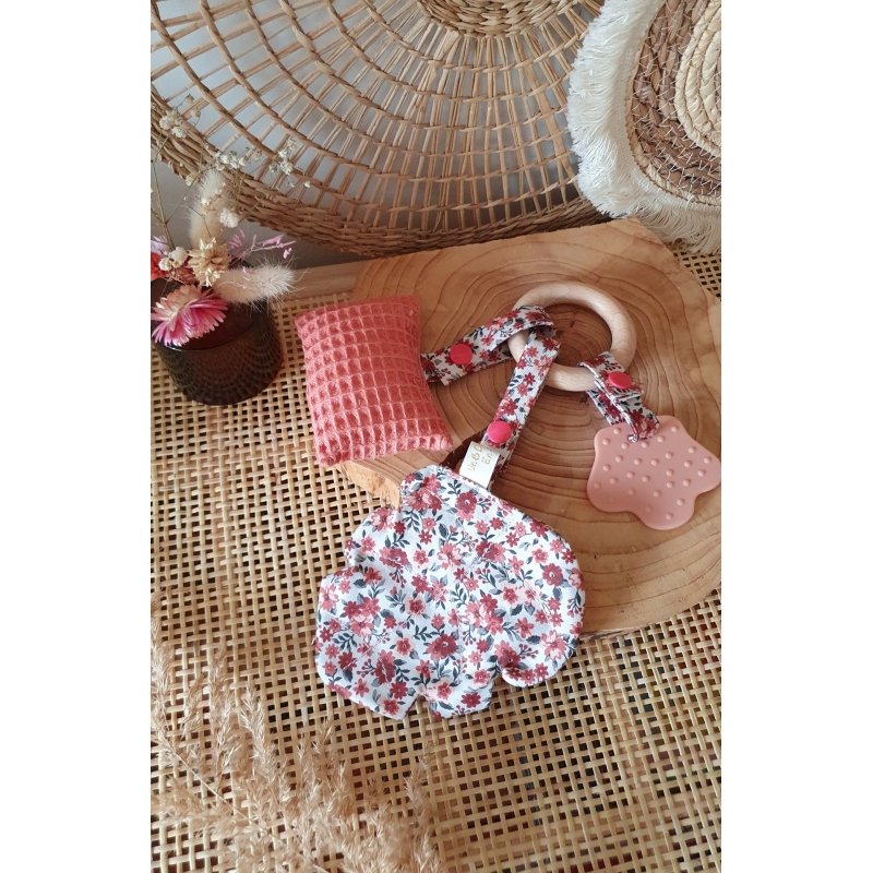 Hochet pour bébé avec 3 jouets de matières et bruits différents : une feuille en papier bruissant, un petit coussin texture nid d abeille avec un petit hochet à l'intérieur, et un anneau de dentition à machouiller ! Les 3 éléments sont reliés à un anneau en bois spécialement conçu pour les bébés.