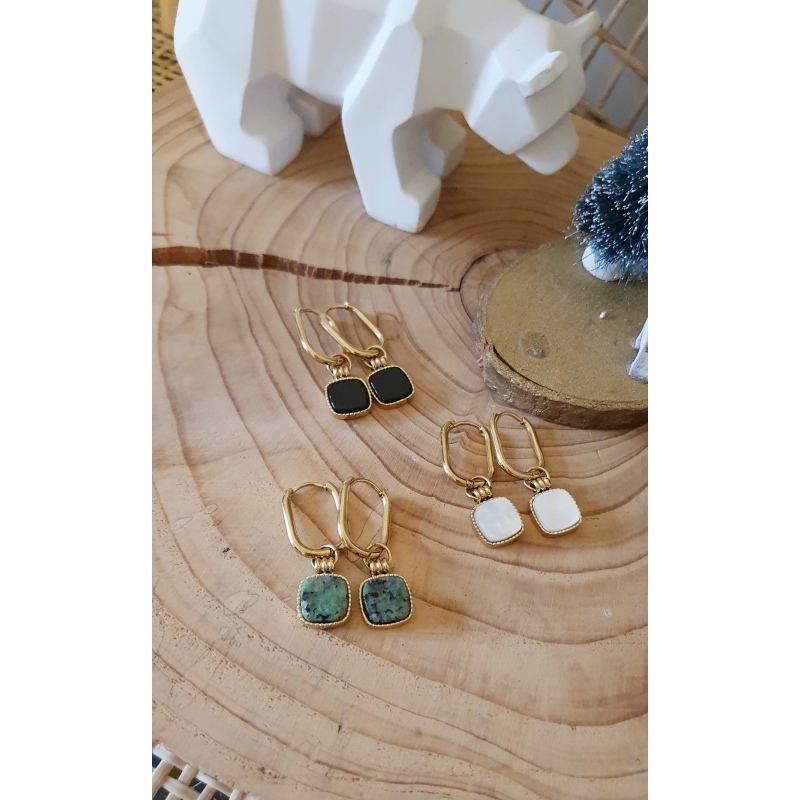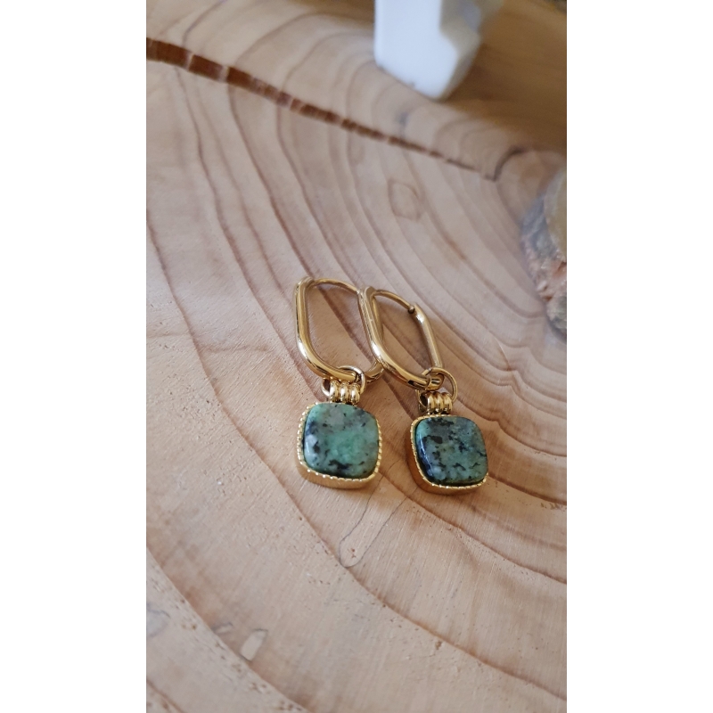 Boucles d'oreilles type créoles à fermoir charnière ornées d'un pendentif carré en pierre naturelle.
