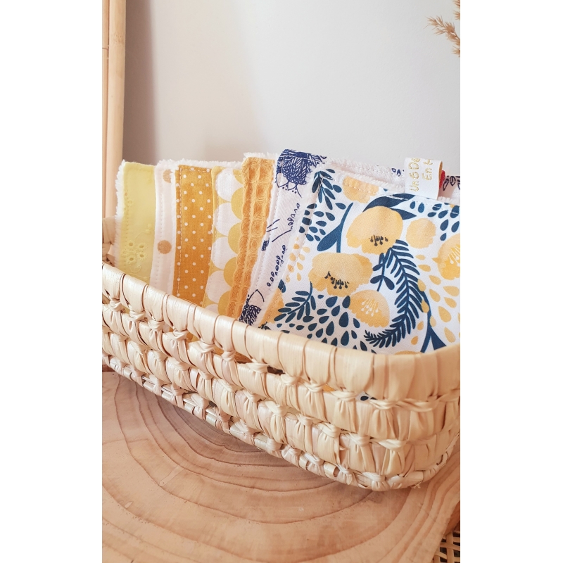 Jolie corbeille en doum, issu de l'artisanat marocain , accompagnée d'un lot de 7 cotons lavables.
